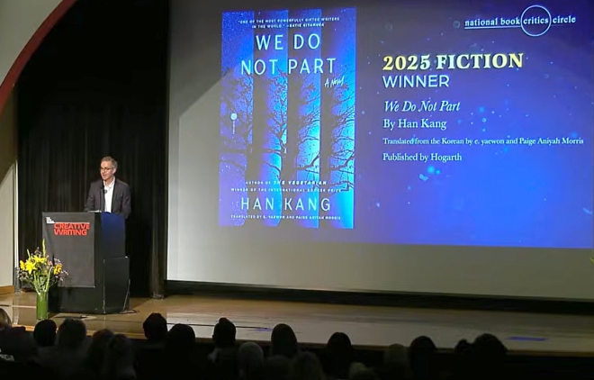 ▲ 지난 26일(현지시간) 미국 뉴욕에서 열린 전미도서비평가협회상 시상식에서 한강의 장편소설 ‘작별하지 않는다’(영어판 ‘We Do Not Part’)가 소설 부문 수상작으로 선정됐다.